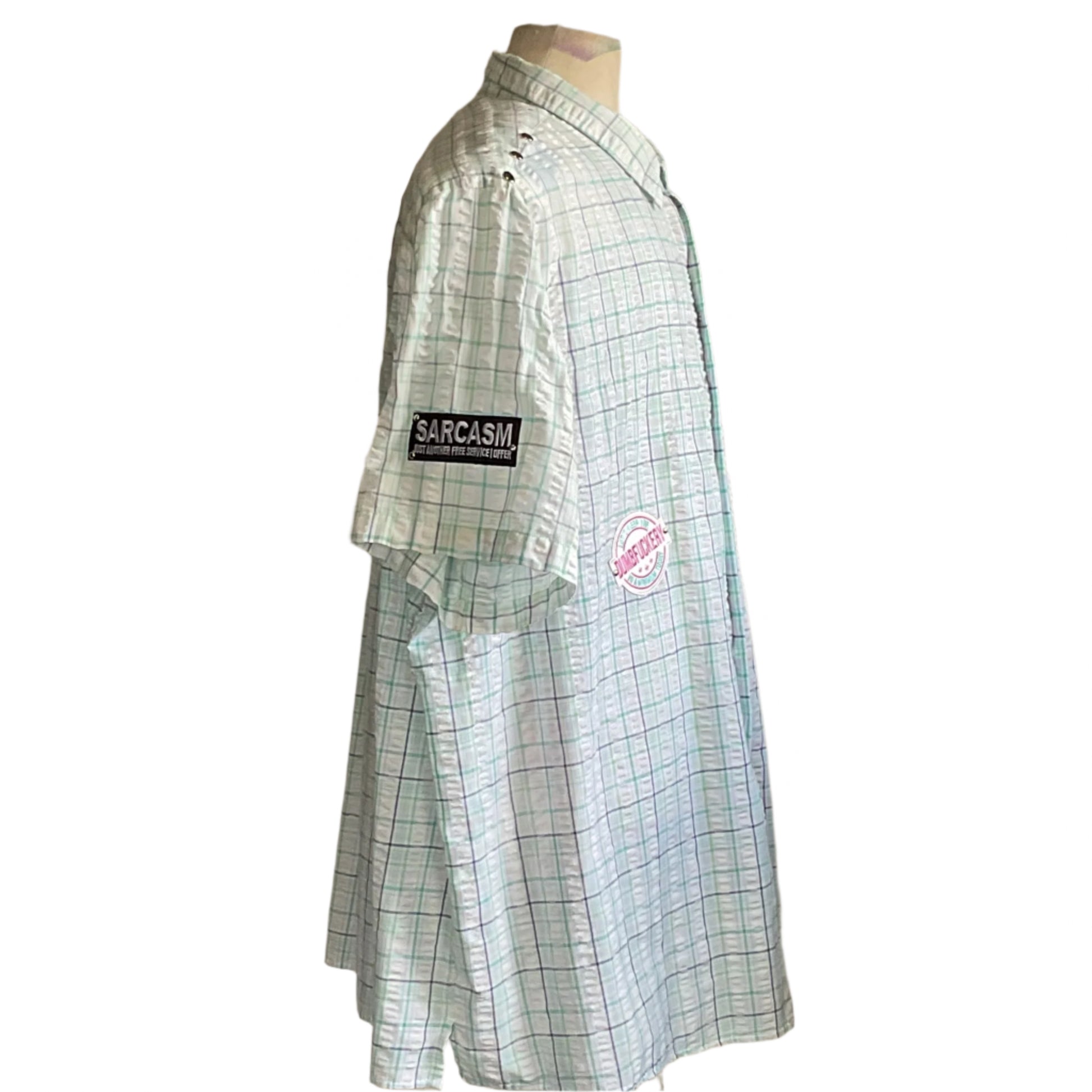 Detail: Lt. aqua “seersucker” with assorted patches and transfers